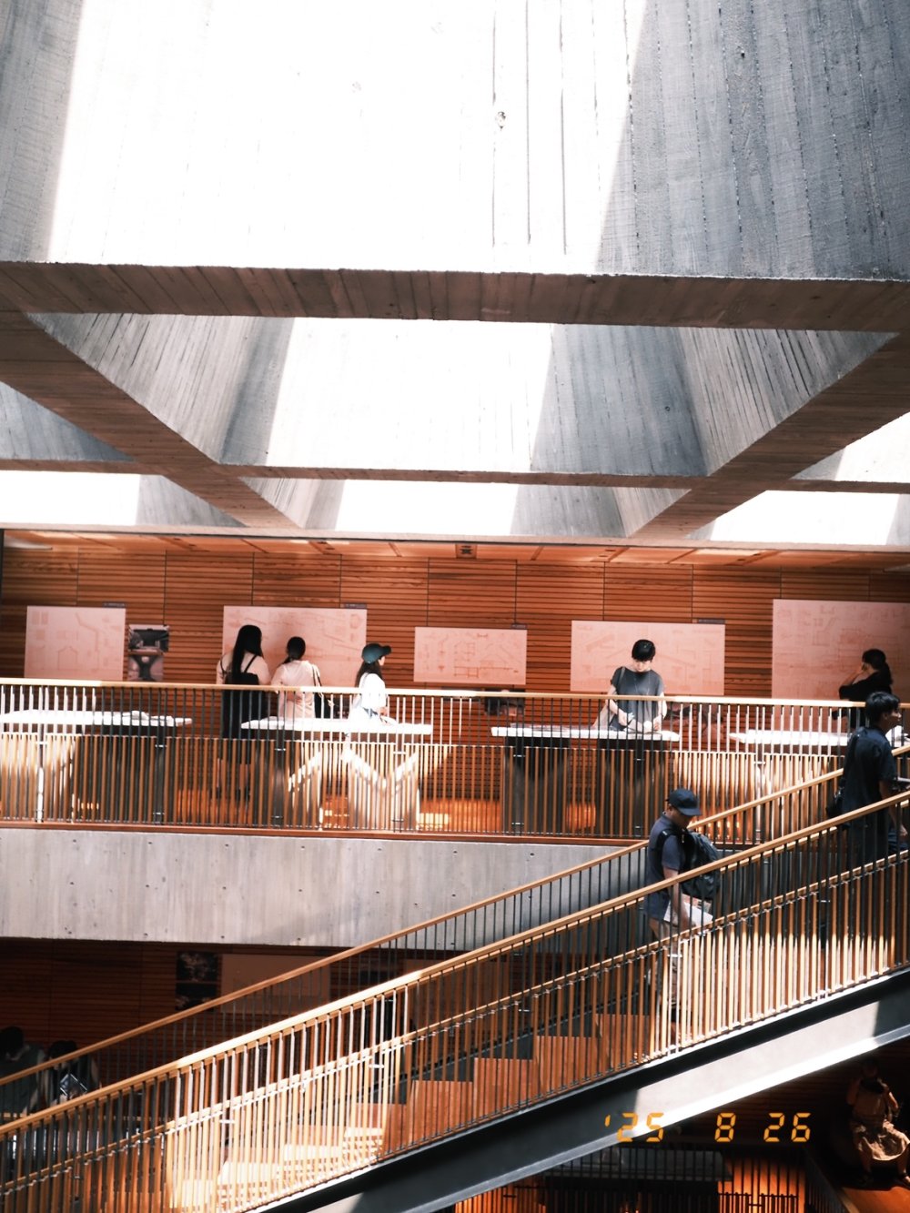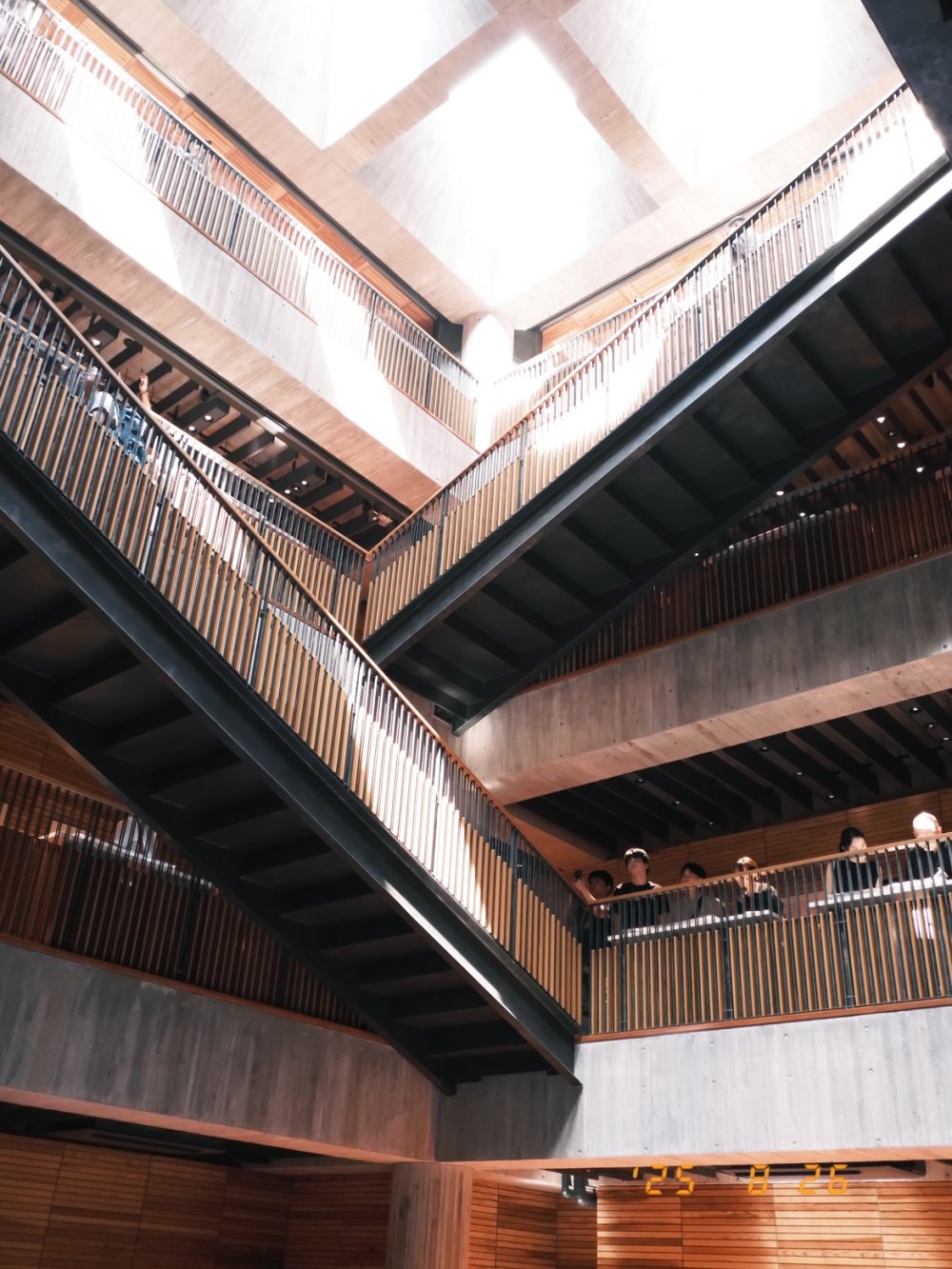 トップライトからの光の降り方や、木とコンクリート・ガラスを組み合わせることで