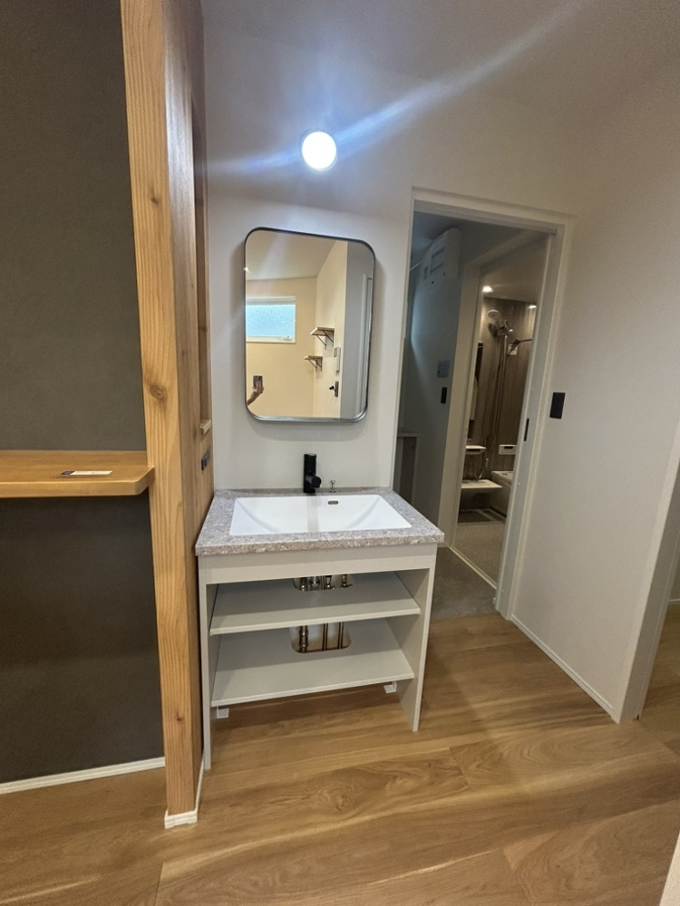 帰宅してすぐ手を洗える、だけでなく、あえて独立させて魅せる洗面化粧台という考え方。