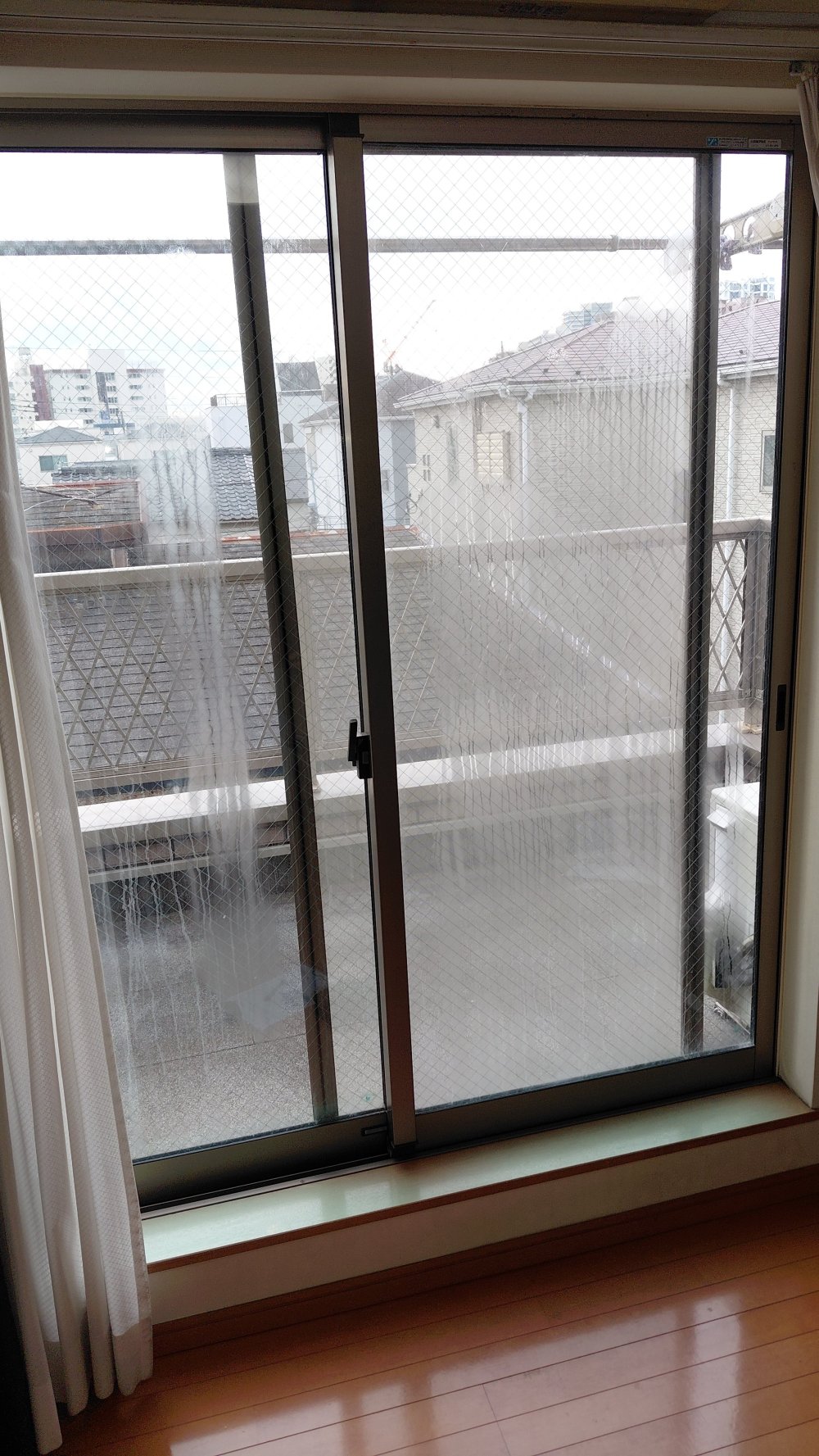 このように結露が生じてきたらガラスの交換が必要です。(サッシ枠は再利用できます)