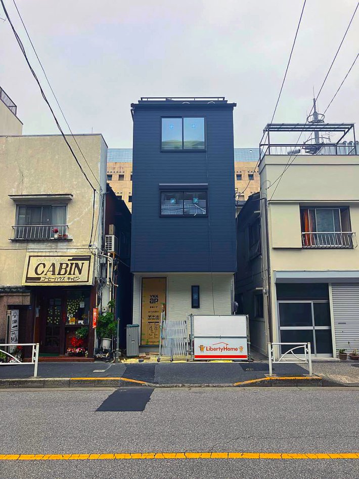 - 敷地14.5坪の長方形狭小地に建つ、3階建ての住宅