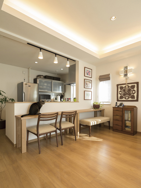 コンパクトなカウンターは壁から離せばダイニングテーブルに変身するアイデア造作家具です。